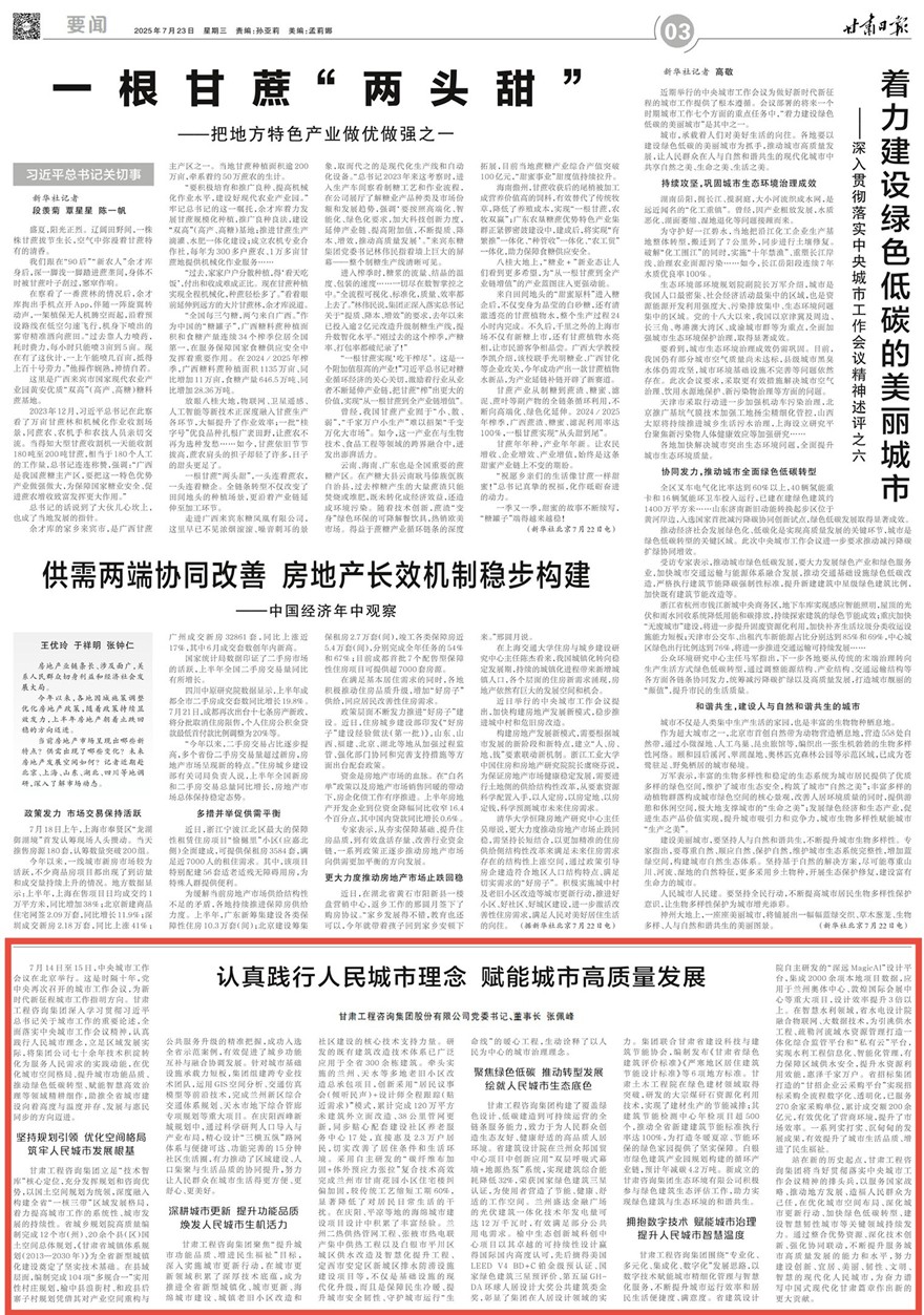 7月14日至15日,中央城市工作會議在北京舉行。這是時隔十年,黨中央再次召開的城市工作會議,為新時代新征程城市工作指明方向。甘肅工程咨詢集團(tuán)深入學(xué)習(xí)貫徹習(xí)近平總書記關(guān)于城市工作的重要論述,全面落實中央城市工作會議精神,認(rèn)真踐行人民城市理念,立足區(qū)域發(fā)展實際,將集團(tuán)公司七十余年技術(shù)積淀轉(zhuǎn)化為服務(wù)人民需求的實踐動能,在優(yōu)化城市空間格局、提升城市功能品質(zhì)、推動綠色低碳轉(zhuǎn)型、賦能智慧高效治理等領(lǐng)域精耕細(xì)作,助推全省城市建設(shè)向著高度與溫度并存、發(fā)展與惠民同步的方向邁進(jìn)。