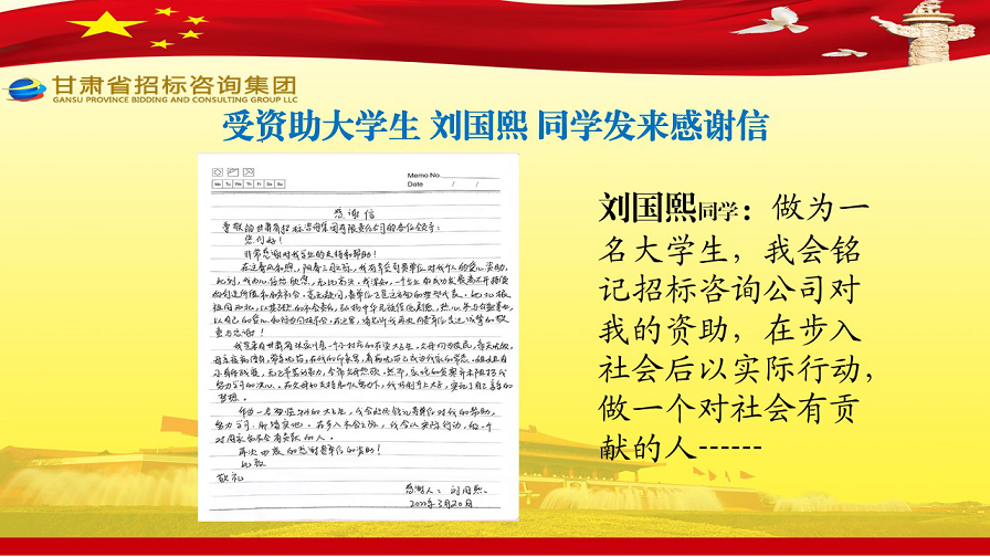 近日,張家川縣張棉驛鄉(xiāng)張棉村貧困大學(xué)生代表劉國(guó)熙、周長(zhǎng)斌、李雪峰等向甘肅省招標(biāo)咨詢集團(tuán)有限責(zé)任公司發(fā)來感謝信,就招標(biāo)咨詢集團(tuán)給予學(xué)費(fèi)資助一事表達(dá)他們的感激之情。