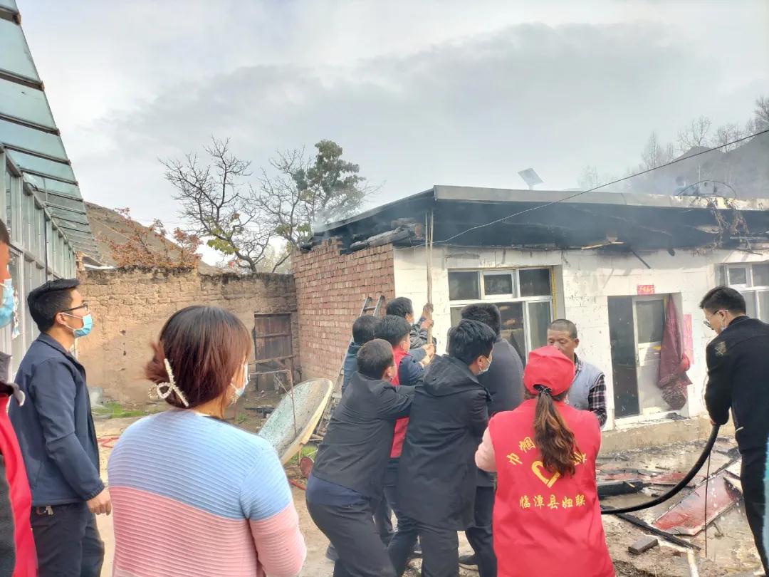 聽到村民們的呼救聲,正在村口疫情防控監(jiān)測點(diǎn)值守的幫扶工作隊(duì)隊(duì)員、包村干部與鎮(zhèn)領(lǐng)導(dǎo)、村“兩委”干部及志愿者一起,第一時(shí)間沖向了火災(zāi)現(xiàn)場,實(shí)施開展撲救工作?,F(xiàn)場火勢兇猛,盡管眾人一起用水傾澆,卻仍未阻止火勢蔓延。瞬間,屋頂?shù)臋M梁也燒著了,發(fā)出噼啪的響聲,房頂隱約在搖晃,可大家依然奮不顧身地救火,甚至有人沖上了危險(xiǎn)的屋頂。