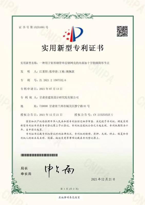 近日,從國家知識(shí)產(chǎn)權(quán)局傳來好消息,由建筑設(shè)計(jì)院總工程師張舉濤、設(shè)計(jì)四所總工程師江重陽、設(shè)計(jì)五院總工程師王棟、設(shè)計(jì)四所工程師姚佩歆聯(lián)合申報(bào)的“一種用于矩形鋼管單層鋼網(wǎng)殼的內(nèi)部加十字肋圓筒形節(jié)點(diǎn)”技術(shù),喜獲國家實(shí)用新型專利。