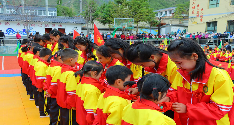 活動(dòng)現(xiàn)場(chǎng),在莊嚴(yán)激昂的國(guó)歌聲中舉行了升國(guó)旗儀式。簡(jiǎn)單而又隆重的入隊(duì)儀式上,鮮紅的隊(duì)旗迎風(fēng)飄揚(yáng),隨著入隊(duì)隊(duì)員名單的宣布,許多一年級(jí)的同學(xué)成為了光榮的中國(guó)少年先鋒隊(duì)隊(duì)員,并由高年級(jí)的少先隊(duì)員為他們戴上了鮮艷的紅領(lǐng)巾。隨后,大隊(duì)輔導(dǎo)員帶領(lǐng)新隊(duì)員宣誓,響亮的呼號(hào)聲“時(shí)刻準(zhǔn)備著”響徹校園上空,集中展示了新時(shí)代少先隊(duì)員積極向上的精神風(fēng)貌,全體師生為他們送上最深的祝福。最后,新隊(duì)員代表發(fā)言,標(biāo)準(zhǔn)的隊(duì)禮、堅(jiān)定的眼神、稚嫩的聲音表達(dá)了最大的決心,號(hào)召全體新隊(duì)員要在星星火炬的指引下刻苦讀書(shū),從小聽(tīng)黨話、感黨恩、跟黨走,努力成長(zhǎng)為中國(guó)特色社會(huì)主義事業(yè)建設(shè)者和接班人。