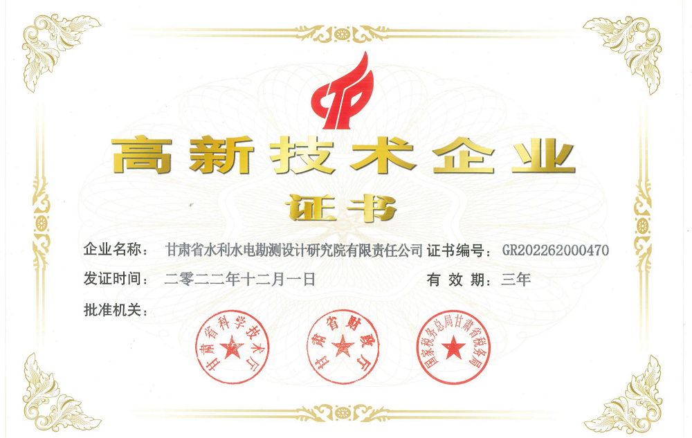 日前,甘肅省水利水電勘測設(shè)計研究院有限責(zé)任公司獲得甘肅省科技廳、甘肅省財政廳、國家稅務(wù)總局甘肅省稅務(wù)局聯(lián)合頒發(fā)的“高新技術(shù)企業(yè)證書”(證書編號:GR202262000470),標(biāo)志著水電設(shè)計院正式邁入國家高新技術(shù)企業(yè)行列,是企業(yè)發(fā)展的又一個重要里程碑。