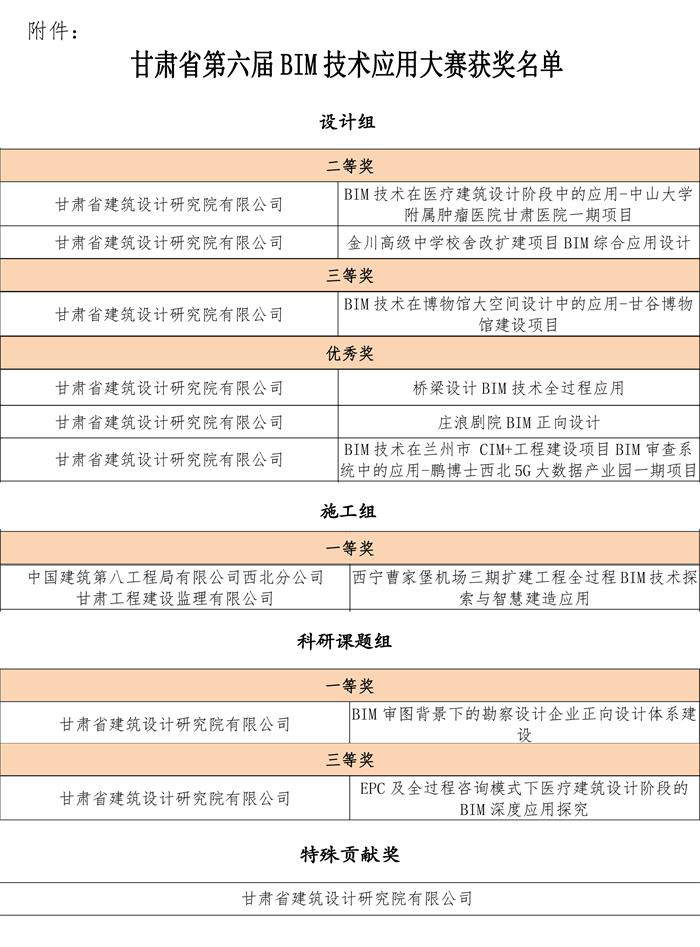 近日,甘肅省第六屆BIM技術(shù)應(yīng)用大賽落下帷幕,省建筑設(shè)計(jì)院選送的9項(xiàng)作品,經(jīng)過(guò)層層篩選、答辯評(píng)審,最終在185個(gè)參賽作品中脫穎而出,并分別獲獎(jiǎng)。省建筑設(shè)計(jì)院榮獲特殊貢獻(xiàn)獎(jiǎng)。