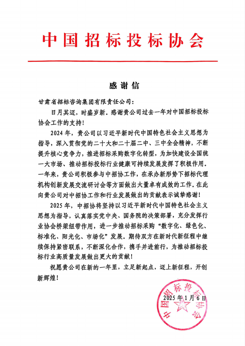 中招協(xié)在信中表示,2024年,省招標(biāo)集團(tuán)順利承辦“新形勢(shì)下招標(biāo)代理機(jī)構(gòu)創(chuàng)新發(fā)展交流研討會(huì)”,在推進(jìn)招標(biāo)采購(gòu)數(shù)字化轉(zhuǎn)型、加快建設(shè)全國(guó)統(tǒng)一大市場(chǎng)、推動(dòng)招標(biāo)投標(biāo)行業(yè)健康可持續(xù)發(fā)展等方面發(fā)揮了積極作用。
